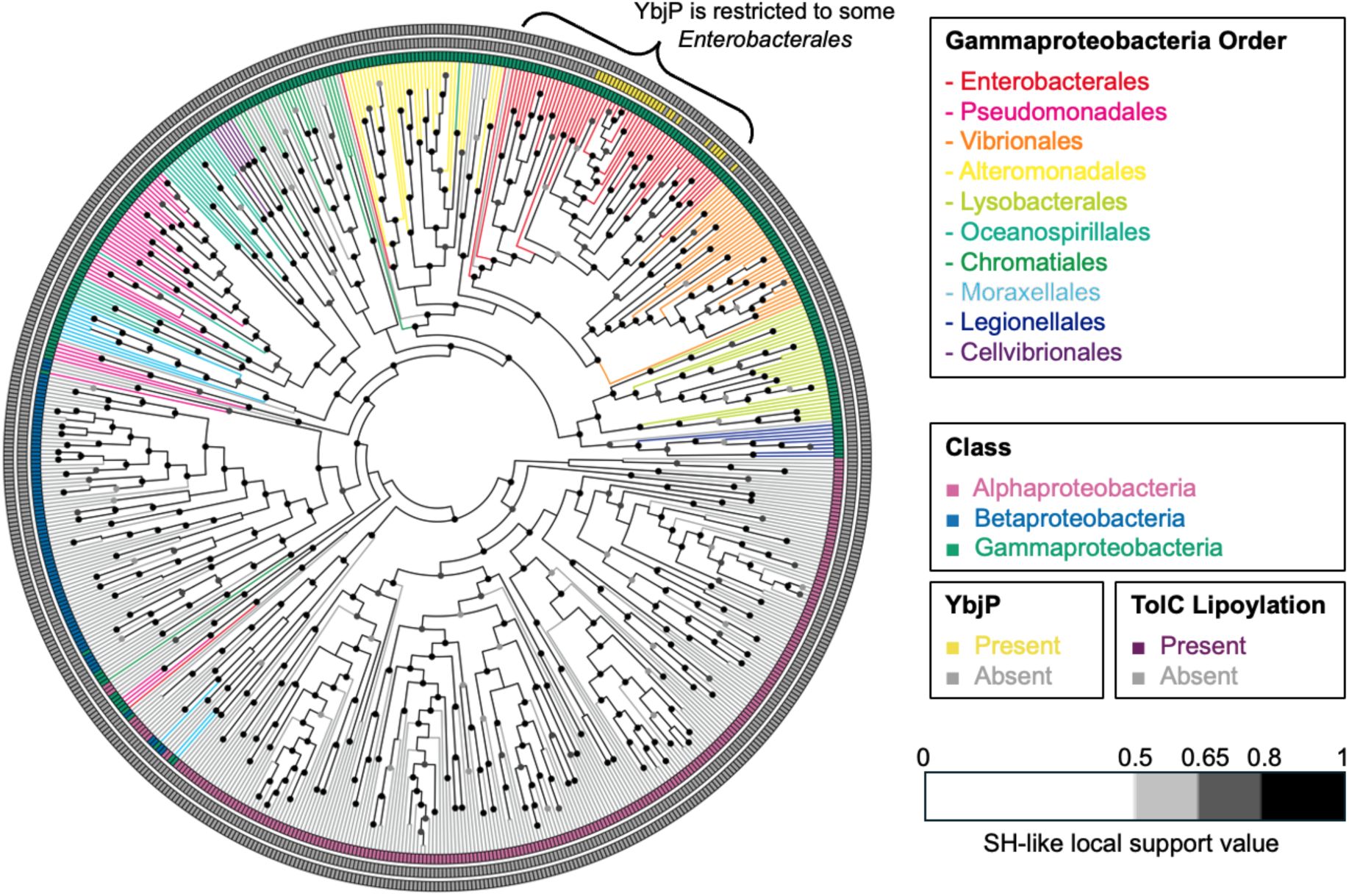 Our structural and functional results indicate that the lipoprotein YbjP is located in the outer membrane, where it can interact with the outer membrane protein TolC. The mode of interaction between TolC and YbjP resembles closely the intramolecular interactions of the lipoylated N-terminus in TolC paralogs, such as OprM from Salmonella. The interaction is likely functionally important within some Enterobacterales. It is proposed that the TolC archetype may bear sequence or environmental features that have limited its distribution, or it is a more recently evolved form in the TolC-like protein family (Stubenrauch et al., 2022). It is possible that TolC and YbjP co-evolved in this lineage.