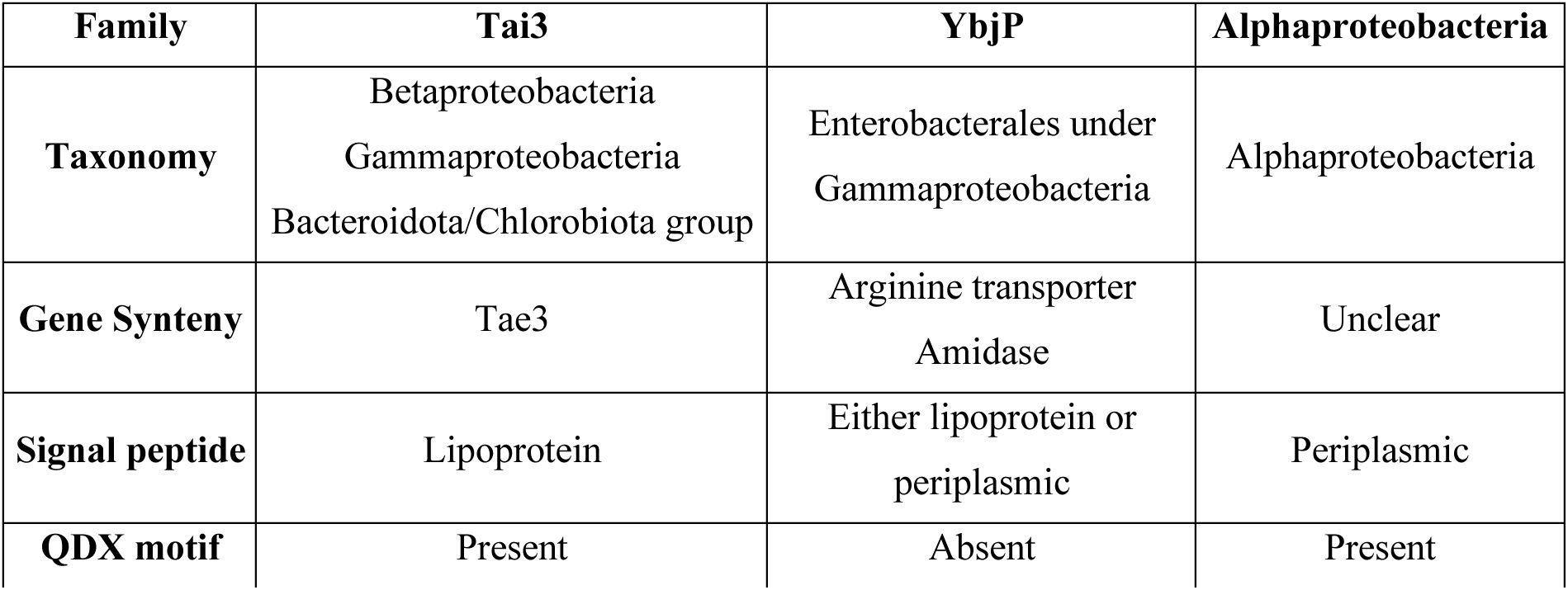 To investigate whether YbjP is functionally homologous to Tai3 or YqhG, we reconstructed a phylogenetic history of the DUF3828-containing proteins, which could be classified into three major families based on taxonomy, gene synteny, presence of a signal peptide and a conserved QDX motif, involved in Tae3 inhibition (Supplementary Table S4). The result indicates that the function of YbjP is likely distinct from that of Tai3 or YqhG (Figure 4B). We noted that Tai3 is found in a broader range of bacterial groups (Gammaproteobacteria, Betaproteobacteria, and Bacteroidota/Chlorobiota) compared to YbjP. Similarly, YbjP is restricted to some members of the Enterobacterales Order within the class of Gammaproteobacteria, unlike TolC which is more widespread (Supplementary Figure S3). Notably, the TolC-YbjP interface is more conserved in Enterobacterales with YbjP than without (Figure 4C), suggesting a scenario where YbjP evolved recently from an ancestral Tai3-like protein to become a TolC interactor.
