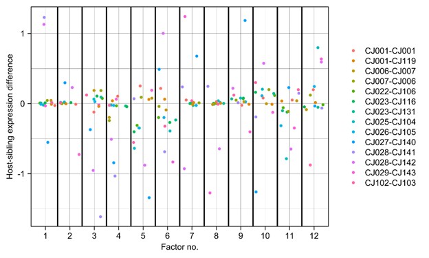Gene-expression pathways/factors did (within some animals) did show host-twin differences in expression levels, but without a consistent host-twin direction of effect that was shared across the many host-twin comparisons. In particular, we used the PEER analysis that we have performed above and calculated the host-sibling expression level difference for each latent factor. Many factors differed in expression in individual cases, though none did so in all cases nor in a consistent-sign manner: