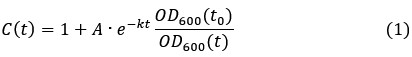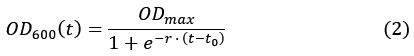 is the dilution factor which takes into account dilution by cell division. OD600(t) was determined by fitting the OD600 measurements by the following the equation describing logistic growth: